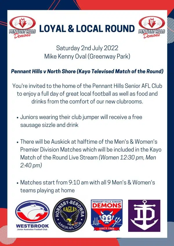 Juniors wearing their club jumper will receive a free sausage sizzle and drink. There will be Auskick at halftime of the Men’s & Women’s Premier Division Matches which will be included in the Kayo Match of the Round Live Stream (Women 12:30 pm, Men 2:40 pm).
