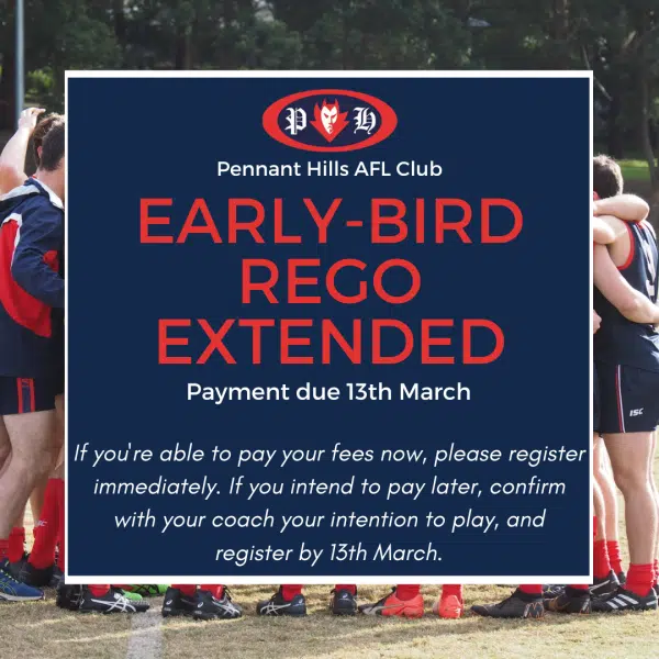 The committee has taken on board issues raised by players having difficulty paying their registration fees at this time of year. To allow you to save, we have extended the early bird cut-off date out till the 13th of March. Full fee-paying players will have 5 weeks from now to save the fee amount.