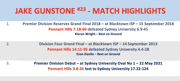 Although his parents are originally from Melbourne, Jake’s first taste of footy was as a five year old, playing Auskick in Tasmania in 1999. When the family moved to Sydney, Jake did Auskick again at Pennant Hills Juniors in 2001. Then between 2003 to 2010, he notched up 90 club games with the Demons playing from the U10s through to the U16s. Along with current clubmates Tim Acheson, Regan Pinker, Theo Moraitis and Adam Nixon, Jake was part of the Pennant Hills U14 premiership side in 2008.