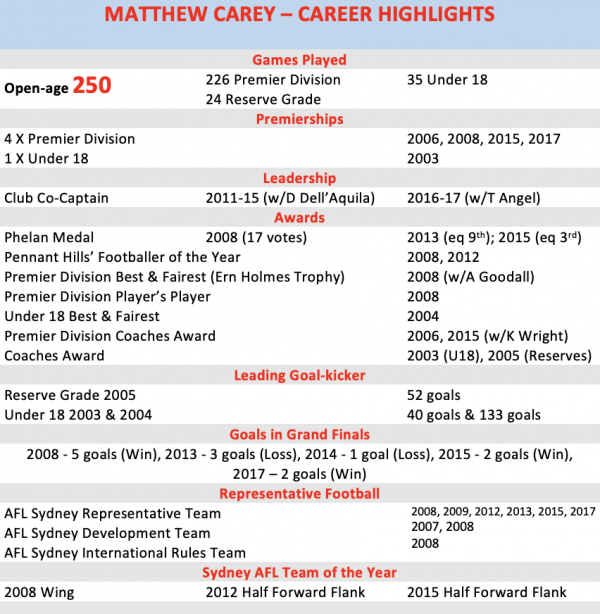 In acknowledging the catalogue of his footballing achievements, we think Matt’s Career Highlights speak volumes about the huge talent and the enormous success he has enjoyed and achieved on the football field. Off-field, King is universally respected, not only as a footballer, but as a leader, mentor, mate and clubman. He is a quality person who sets the example for all those around, a great bloke with the capacity to lead and to bring people together in pursuit of a shared purpose. And make no mistake, no-one deserves his success more than King does, given his passion for the code, his perseverance in the shadow of serious injury and his single-minded commitment to be the very best that he can. We salute one of the Club’s very best players and ambassadors, Matt ‘King’ Carey, and wish him every success in today’s milestone match.