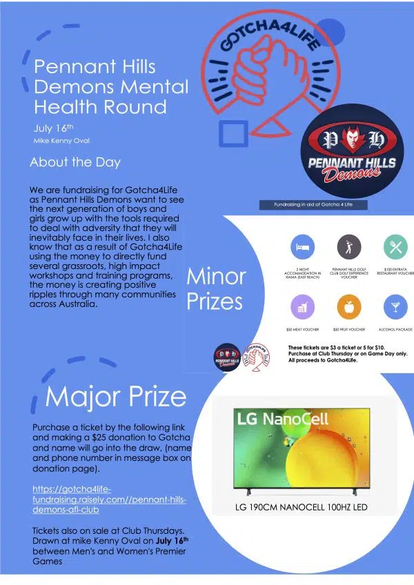 Round 14 (Saturday July 16th) is the Pennant Hills AFL Club’s Mental Health Round. The club is raising funds for Gotcha4Life as Pennant Hills Demons want to see the next generation of boys and girls grow up with the tools required to deal with adversity that they will inevitably face in their lives. Money raised from these raffles directly funds several grassroots, high-impact workshops and training programs, creating positive ripples through many communities across Australia.
