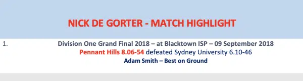 Having convinced himself that Aussie Rules was his preferred code, Nick joined the Pennant Hills Senior Club in 2009 as a 16 year old. He played 34 games in the Under 18s across two seasons 2009 and 2010 and also made his open-age debut in 2010, playing a game in Reserve grade and a couple in third grade.