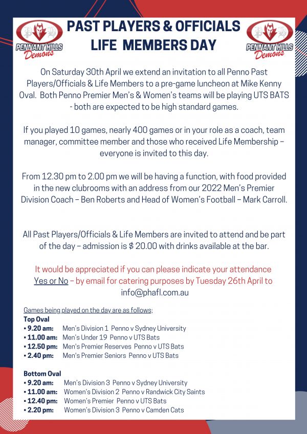 On Saturday 30th April we extend an invitation to all Penno Past Players/Officials & Life Members to a pre-game luncheon at Mike Kenny Oval. Both Premier Men’s & Women’s teams will be playing UTS Bats – both are expected to be high standard games.
