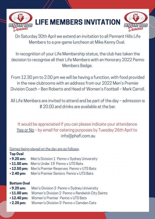 All Past Players/Officials & Life Members are invited to attend and be part of the day – admission is $ 20.00 with drinks available at the bar.