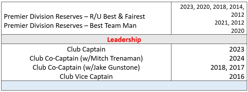 As to leadership, Pat has few peers. He was the reserve’s vice-captain in 2016. In 2017 he was elevated to co-captain with Jake Gunstone and they shared this role again in the 2018 premiership year. He was captain again in 2023 and co-captain in 2024.