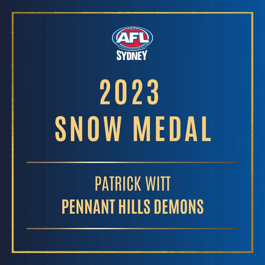 Patrick Witt – Snow Medal Well done to Patrick Witt, who was awarded the Snow Medal at the 2023 Phelan Mostyn Awards Night by Sydney AFL! Pennant Hills AFL Club - Sydney AFL2024-02-23T10:27:03+11:00