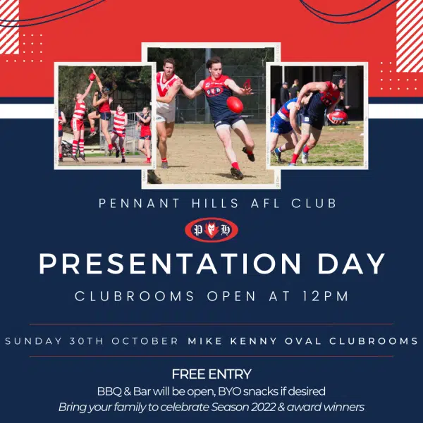 This year’s Presentation Day will be held at the Mike Kenny Oval Clubrooms on Sunday 30th October! Clubrooms will open at midday.