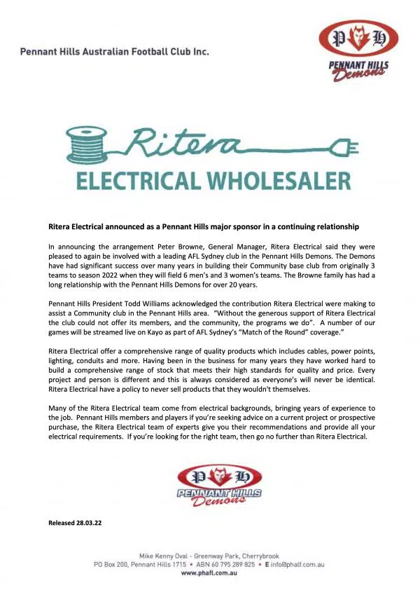 Ritera Electrical has been announced as another Pennant Hills AFL Club’s major sponsor in a continuing relationship. Pennant Hills President Todd Williams acknowledged the contribution Ritera Electrical were making to assist a Community club in the Pennant Hills area. “Without the generous support of Ritera Electrical the club could not offer its members, and the community, the programs we do”. A number of our games will be streamed live on Kayo as part of AFL Sydney’s “Match of the Round” coverage.”